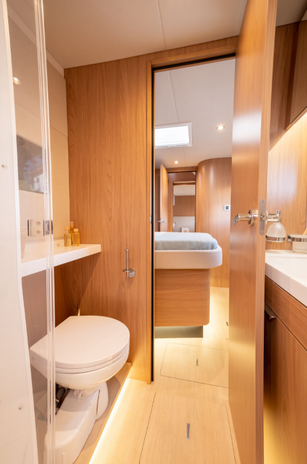 The heart of the yacht lies in its expansive salon, where the innovative hydraulic "garage door" transforms the space instantly, creating an uninterrupted flow between indoor comfort and outdoor freedom. The galley's passthrough access to the forward cockpit ensures effortless entertaining, allowing your crew to serve guests easily throughout the vessel.